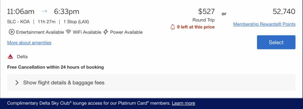 This is a round-trip flight from Salt Lake City to Kona, Hawaii. It's on the same aircraft, for the same day, and the same seat class. Here, you'll see that if I book directly through the American Express travel portal, I'll spend almost 53k points - per person - roundtrip.