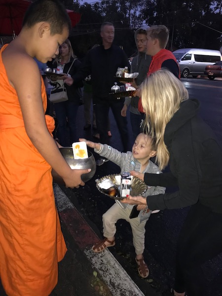 The monks have not eaten since around noon the day before so they are hungry. This is the only food they will get for breakfast. Dressed in their orange robes, heads shorn, the walk barefoot up and down the street waiting to be summoned. They are not allowed to ask for food but only accept once they are summoned. Neither are they allowed to speak. Once you have given them some food, they will give you a blessing in the form of a chant.
