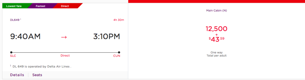 I was able to take advantage of a partner alliance to get our flights from SLC to Cancun flying on Delta for only 12.5k miles each and $43 in taxes. We booked our flight through Delta’s partner airline Virgin Atlantic instead of Delta directly. Even though we booked through Virgin Atlantic, we will still check in at the Delta counter and use our Delta loyalty numbers like normal. We will also even be able to take advantage of the Delta Skyclub and our Delta airline status.