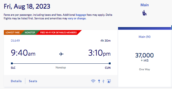 This fight would have cost me $448 if I would have booked a cash price. If I would have booked through Delta, it would have cost me 37k points + $45 in taxes. By utilizing the Skyteam Airline Alliance, I was able to get the flight for 12.5k points and $43 in taxes.