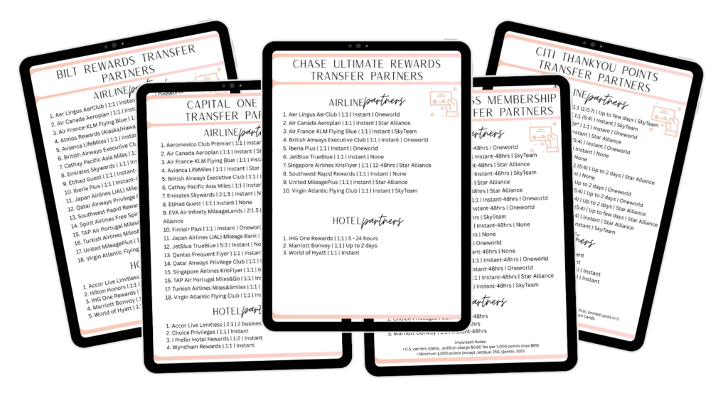 Want my complete Transfer Partner Cheat Sheets for all 5 major credit card rewards programs?